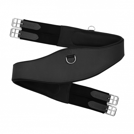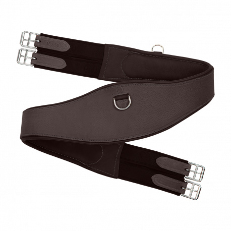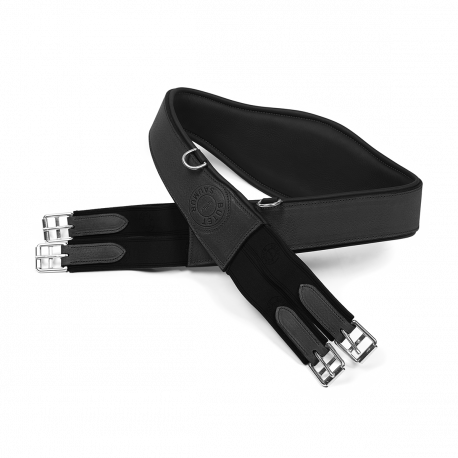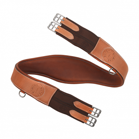Sangle classique en cuir grainé estampillée BUTET. La sangle classique ergonomique est équipée d’un mousqueton central et d’un anneau d’attache de chaque côté ainsi que quatre élastiques aux extrémités.