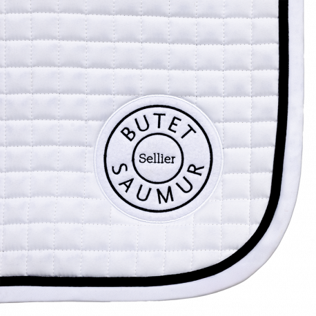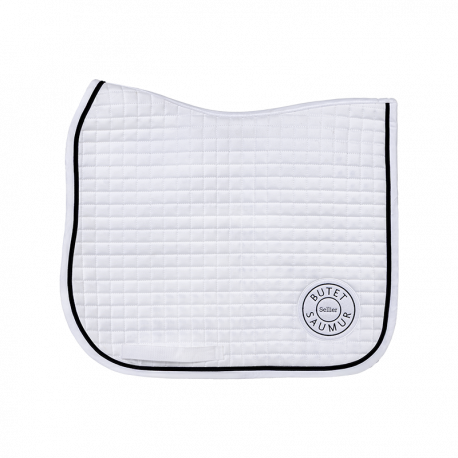 White dressage style saddle pad, embroidered with pearl grey Butet logo, white cord. Rippled padding and honeycomb lining designed to be breathable and to absorb perspiration